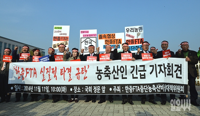 지난 10일, 한중FTA가 타결된 가운데, 한중FTA중단농축산비상대책위원회가 이튿날인 11일 오후, 서울 여의도 국회 앞에서 ‘한중FTA 실질적 타결 규탄’ 농축산인 긴급 기자회견을 열고 "한중FTA 실질적 타결을 철회하라"고 촉구하고 있다.