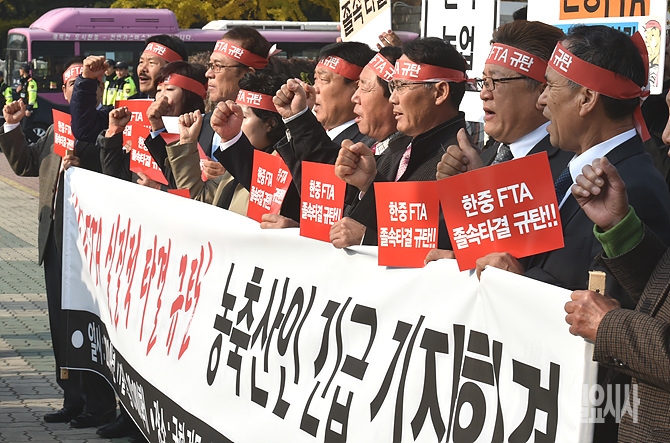 지난 10일, 한중FTA가 타결된 가운데, 한중FTA중단농축산비상대책위원회가 이튿날인 11일 오후, 서울 여의도 국회 앞에서 ‘한중FTA 실질적 타결 규탄’ 농축산인 긴급 기자회견을 열고 "한중FTA 실질적 타결을 철회하라"고 촉구하고 있다.
