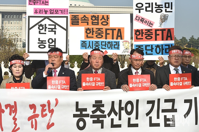 지난 10일, 한중FTA가 타결된 가운데, 한중FTA중단농축산비상대책위원회가 이튿날인 11일 오후, 서울 여의도 국회 앞에서 ‘한중FTA 실질적 타결 규탄’ 농축산인 긴급 기자회견을 열고 "한중FTA 실질적 타결을 철회하라"고 촉구하고 있다.