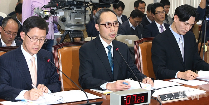 11일 오후 서울 여의도 국회 미래창조과학방송통신위원회 회의실에서 700MHz 대역 용도 관련 공청회가 열린 가운데, 진술인으로 출석한 조규조 미래창조과학부 전파정책국장이 의원들의 질의에 답변하고 있다.