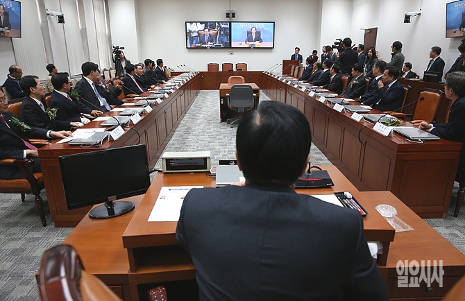 11일 오후, 서울 여의도 국회 영상회의실에서 첫 오픈한 화상회의장비를 의원들이 지켜보고 있는 가운데, 정의화 국회의장과 최문순 강원도지사가 화상회의를 시연하고 있다.