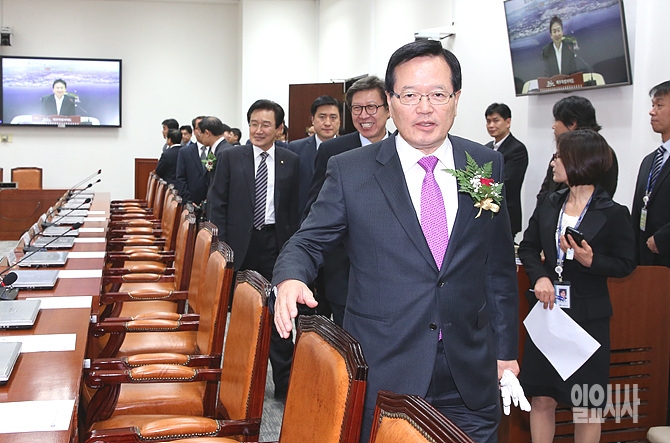 11일 오후, 서울 여의도 국회 영상회의실에서 첫 오픈한 화상회의장비 시연을 위해 정의화 국회의장 및 박형준 사무총장 등이 회의실 안으로 입장하고 있다.