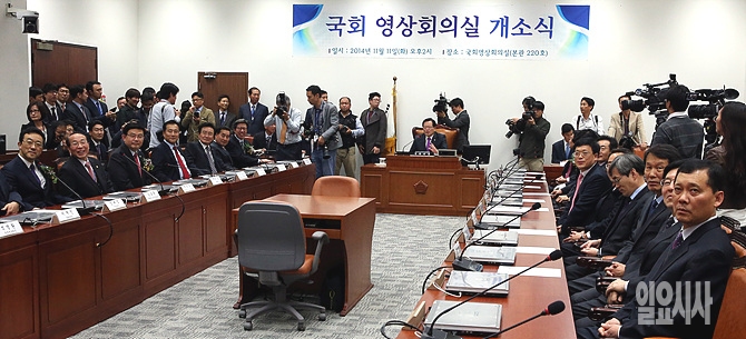 11일 오후, 서울 여의도 국회에 첫 오픈된 영상회의실에서 정의화 국회의장 및 박형준 국회 사무총장 등이 참석한 가운데 시연회를 갖고 있다.