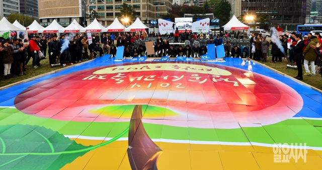 11일 서울시청 앞 광장에서 열린 '서울시민과 함께하는 2014 청송사과축제'에서 내빈들이 사과 퍼즐 퍼포먼스를 하고 있다.