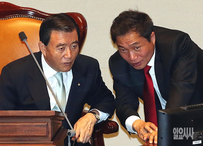 11일, 서울 여의도 국회에서 329회 국회(정기회) 예산결산특별위원회 6차 전체회의가 열리고 있는 가운데, 홍문표 예결특위 위원장이 이학재 여당 간사와 이야기를 나누고 있다.