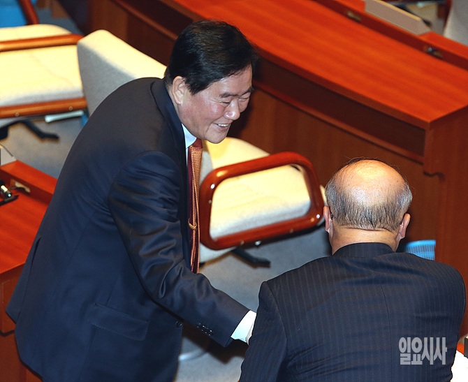 11일, 최경환 경제부총리, 이동필 농림축산식품부장관 등이 출석한 가운데 서울 여의도 국회에서 329회 국회(정기회) 예산결산특별위원회 6차 전체회의 직전, 최 부총리와 한 예결위원이 악수를 나누고 있다.