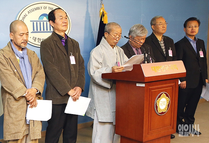 시민사회 종교계 회원들이 11일, 서울 여의도 국회 정론관에서 '김영란법 제정'을 촉구하는 기자회견을 갖고 있다.