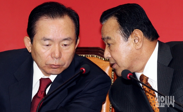 새누리당 이완구 원내대표(오른쪽)와 이인제 최고위원이 12일 서울 여의도 국회에서 열린 최고중진연석회의에서 대화하고 있다.