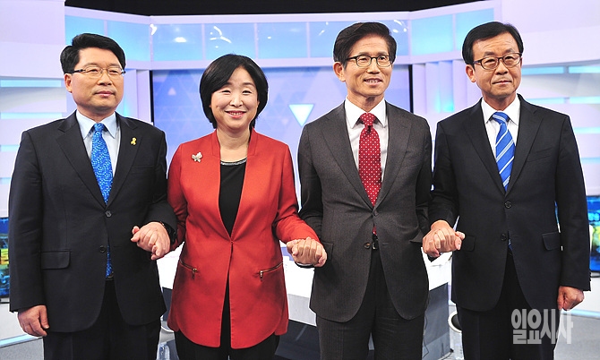 원혜영 새정치민주연합 정치혁신실천위원장(사진 오른쪽부터)과 김문수 새누리당 보수혁신특별위원장, 심상정 정의당 정치똑바로특별위원장, 오병윤 통합진보당 원내대표가 12일 오전, 서울 여의도 KBS에서 열린 '정치개혁, 어떻게 이룰 것인가' 정책 토론회 직전, 포즈를 취하고 있다. (사진공동취재단)