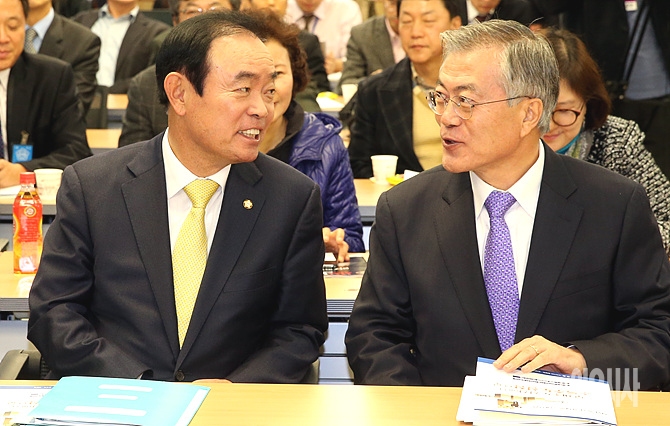 12일, 새정치민주연합 문재인 의원이 서울 여의도 국회 의원회관에서 열린 '사람중심 경제로의 대전환-부채주도성장에서 소득주도성장으로' 정책토론회에서 장병완 의원과 대화하고 있다.