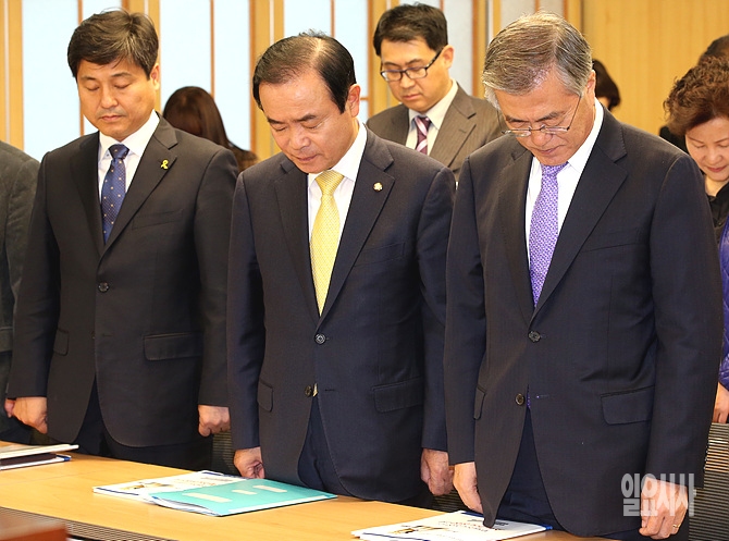 12일, 새정치민주연합 문재인·장병완 의원 등이 서울 여의도 국회 의원회관에서 열린 '사람중심 경제로의 대전환-부채주도성장에서 소득주도성장으로' 정책토론회 직전, 묵념을 하고 있다.