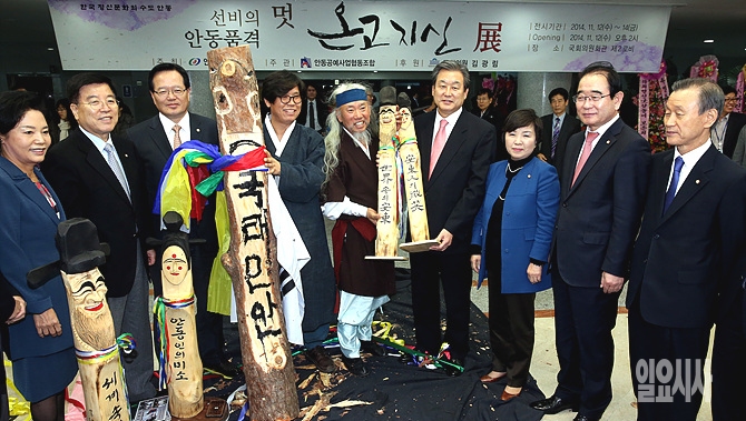 12일 오후 서울 여의도 국회 의원회관에서 새누리당 김광림 의원(사진 왼쪽서 두 번째) 주최로 열린 안동공예문화전시관 개관 9주년 기념 '선비의 멋 안동품격 온고지신전'에서 김무성 대표(사진 오른쪽서 네 번째)가 장인과 함께 장승을 들어보이고 있다.