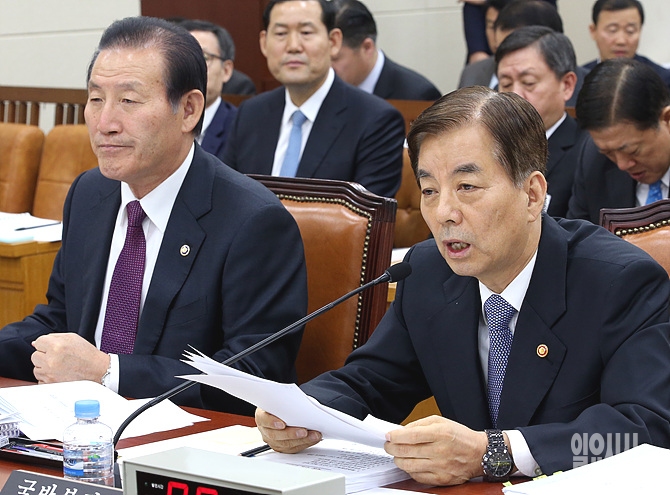 12일, 서울 여의도 국회 국방위원회 회의실에서 열린 예산안 전체회의에서 한민구 국방부장관이 의원들의 질의에 답변하고 있다.