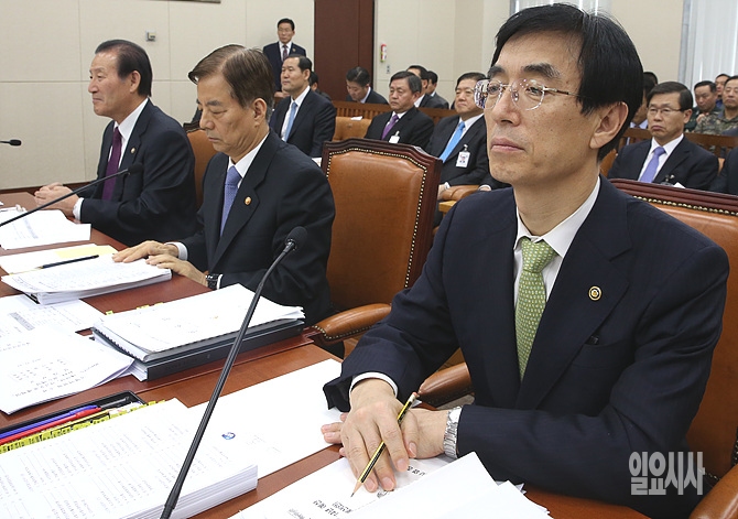 12일, 서울 여의도 국회 국방위원회 회의실에서 열린 예산안 관련 전체회의에 이용걸 방위사업청장, 한민구 국방부장관, 박창명 병무청장(사진 왼쪽부터)이 출석해 의원들의 질의를 듣고 있다.