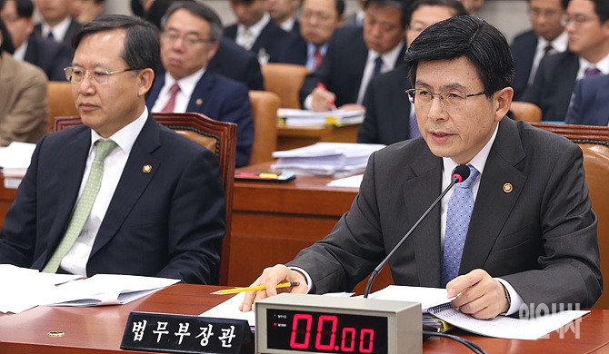 12일, 서울 여의도 국회 법제사법위원회 회의실에서 열린 예산안 관련 전체회의에 황교안 검찰총장이 의원들의 질의에 답변하고 있다.