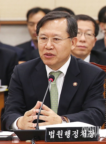 12일, 서울 여의도 국회 법제사법위원회 회의실에서 열린 예산안 관련 전체회의에서 박병대 법원행정처장이 의원들의 질의에 답변하고 있다.