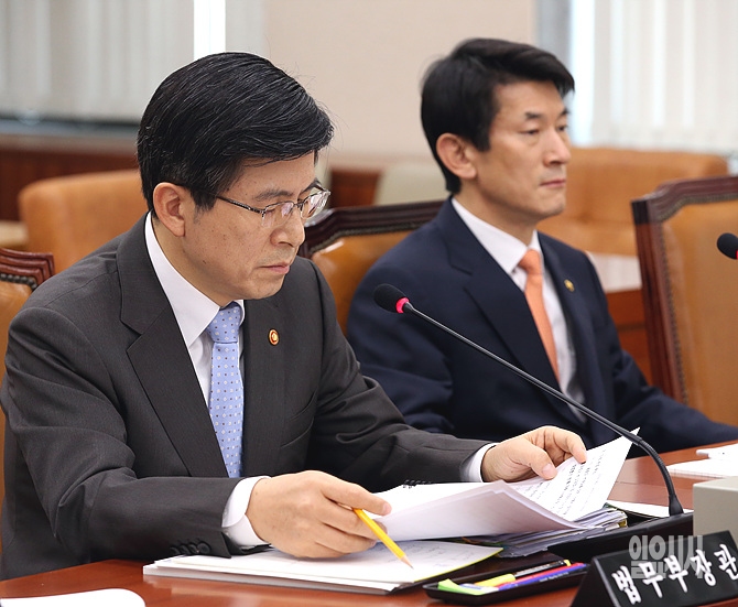 12일, 서울 여의도 국회 법제사법위원회 회의실에서 열린 예산안 관련 전체회의에 황교안 검찰총장이 출석해 답변자료를 살피고 있다.