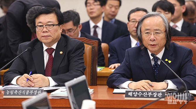 12일, 서울 여의도 국회 농림축산식품해양수산위원회 회의실에서 열린 예산안 관련 전체회의에 이주영 해양수산부장관(사진 오른쪽)이 의원들의 질의에 답변하고 있다.