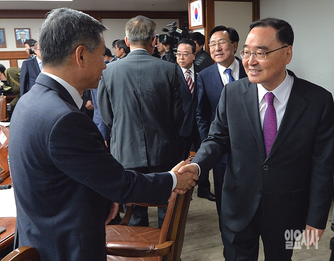 정홍원 국무총리가 12일 오전, 서울 여의도 중소기업중앙회에서 열린 '총리와 함께하는 중소기업 간담회' 직전, 참석자들과 악수를 나누고 있다.