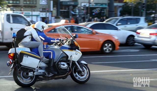 2015학년도 대학수학능력시험이 실시된 13일 서울 안국동 풍문여고 시험장 앞에서 한 수험생이 경찰 사이카를 타고 시험장으로 향하고 있다.