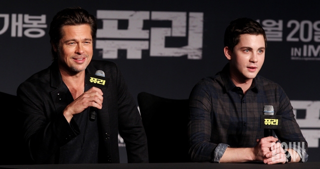 할리우드 배우 브래드 피트(왼쪽)와 로건 레먼이 13일 서울 여의도 콘래드 호텔에서 열린 영화 '퓨리'(감독 데이비드 에이어) 내한 기자회견을 갖고 있다.
