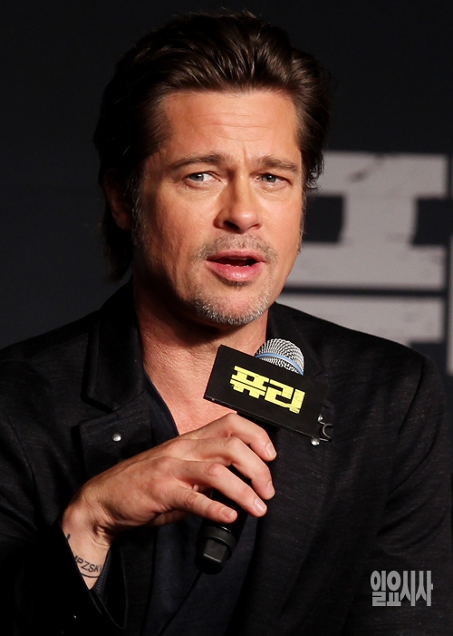 할리우드 배우 브래드 피트가 13일 서울 여의도 콘래드 호텔에서 열린 영화 '퓨리'(감독 데이비드 에이어) 내한 기자회견에서 취재진의 질문에 답하고 있다.