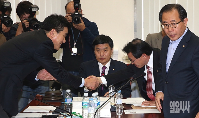 13일, 서울 여의도 국회에서 한-호주·캐나다 FTA 비준동의안 처리를 위해 심윤조 소위원장 주재로 외교통일위원회 법안심사소위원회에서 김태호(사진 왼쪽)-심재권 의원이 악수를 나누고 있다.