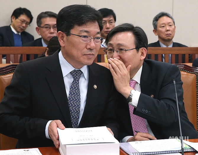 13일, 서울 여의도 국회 외교통일위원회 회의실에서 열린 전체회의 도중 윤상직 산업통상자원부장관이 관계자로부터 귓속말 보고를 받고 있다.