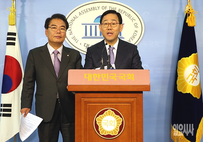 주호영 새누리당 정책위의장(사진 오른쪽)과 백재현 새정치민주연합 정책위의장이 13일, 서울 여의도 국회 정론관에서 여야정 FTA협의체 합의문 발표 기자회견을 갖고 있다.