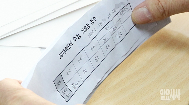 14일 서울 서초고등학교에서 선생님이 2015학년도 대학수학능력시험을 마친 수험생들이 제출한 가채점표를 들고 있다.