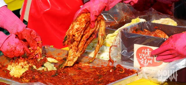 14일 서울시청 앞 광장에서 열린 '2014 한국야쿠르트 사랑의 김장나누기' 행사에서 참석자들이 김장을 하고 있다.