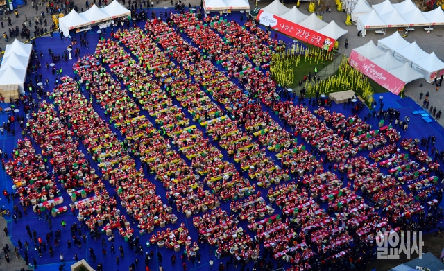 14일 서울시청 앞 광장에서 열린 '2014 한국야쿠르트 사랑의 김장나누기' 행사에서 참석자들이 김장을 하고 있다.