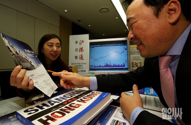 상하이·홍콩 증시간 교차거래인 후강퉁이 17일 본격 시작된 가운데 서울 중구 유안타증권을 찾은 고객이 후강퉁 관련 상담을 받고 있다.