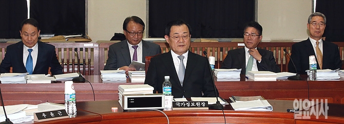17일, 서울 여의도 국회에서 내년도 국정원 예산안 심사를 위한 정보위원회(위원장 김광림) 전체회의가 열린 가운데, 이병기 국정원장과 이헌수 기조실장, 김규석 3차장, 김수민 2차장 등이 출석해 있다.