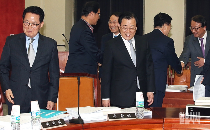 17일, 서울 여의도 국회에서 내년도 국정원 예산안 심사를 위한 정보위원회(위원장 김광림) 전체회의를 위해 새정치민주연합 박지원 의원(사진 왼쪽)이 이병기 국정원장과 입장하고 있다.
