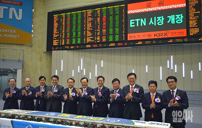 상장지수증권(ETN) 시장개설 및 10종목 신규상장기념식이 열린 17일, 서울 여의도 한국거래소 홍보관에서 참석자들이 기념떡 커닝 전 박수를 치고 있다.