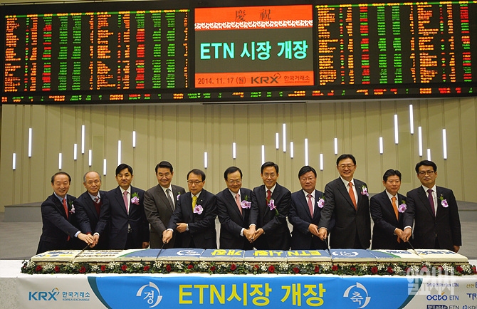 상장지수증권(ETN) 시장개설 및 10종목 신규상장기념식이 열린 17일, 서울 여의도 한국거래소 홍보관에서 참석자들이 기념떡을 자르고 있다.