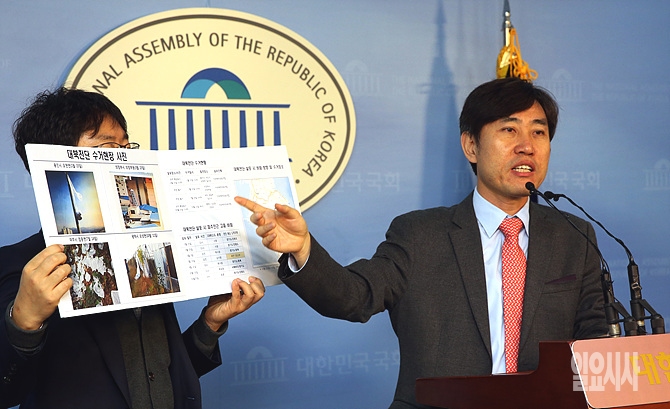 하태경 새누리당 의원이 18일, 서울 여의도 국회 정론관에서 기자회견을 갖고 대북전단 수거현장 사진을 제시하고 있다.