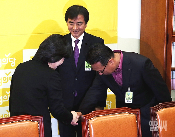 정의당 심상정(사진 왼쪽) 원내대표가 18일 오전, 서울 여의도 국회 정의당 원내대표실에서 롯데 자이언츠 이윤원 신임 단장을 만나 악수를 나누고 있다.