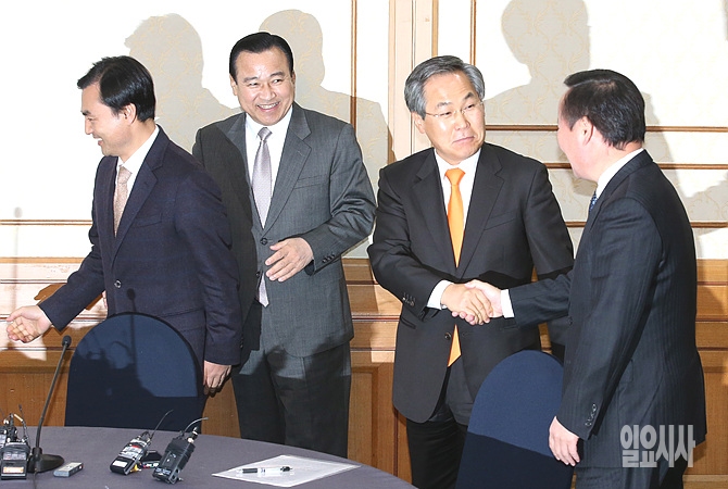 새정치민주연합 우윤근 원내대표(사진 오른쪽서 두 번째)와 김재원 새누리당 원내수석부대표(사진 오른쪽)가 18일 오전, 서울 여의도 국회 귀빈식당에서 열린 여야 원내대표단 주례회동 직전, 악수를 나누고 있다.
