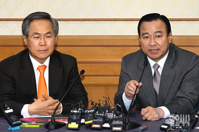 새누리당 이완구(사진 오른쪽)가 18일 오전, 서울 여의도 국회 귀빈식당에서 열린 여야 원내대표단 주례회동서 모두발언하고 있다.
