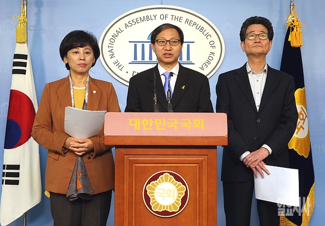 국회 보건복지위원회 소속 새정치민주연합 김성주(사진 가운데) 간사와 남윤인순(사진 왼쪽), 이목희 의원이 18일 오전, 서울 여의도 국회 정론관에서 '세모녀 3법' 관련 브리핑을 갖고 있다.