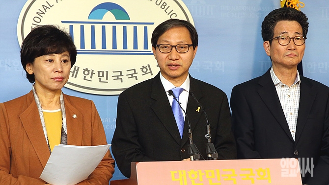 국회 보건복지위원회 소속 새정치민주연합 김성주(사진 가운데) 간사와 남윤인순(사진 왼쪽), 이목희 의원이 18일 오전, 서울 여의도 국회 정론관에서 '세모녀 3법' 관련 브리핑을 갖고 있다.