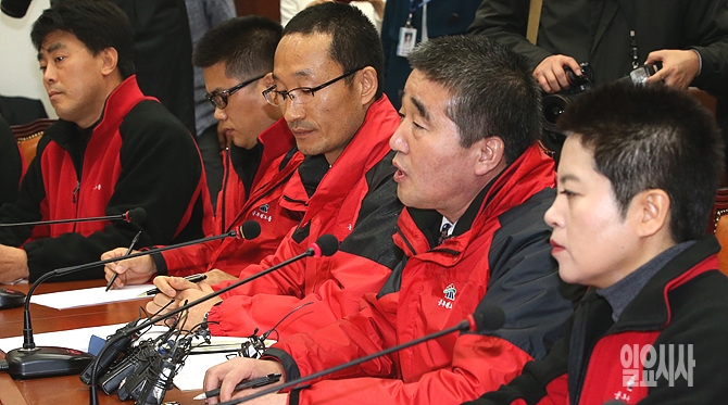 18일, 서울 여의도 새누리당 대표실에서 새누리당 김무성 대표 등 지도부가 ‘대한민국공무원노동조합총연맹’과 '공무원연금 개혁안'을 두고 논의를 위해 한 자리에 모인 가운데, 류영록 공노총 위원장이 발언하고 있다.