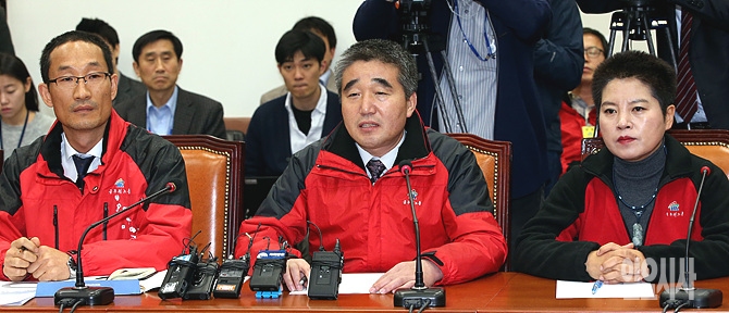 18일, 서울 여의도 새누리당 대표실에서 새누리당 김무성 대표 등 지도부가 ‘대한민국공무원노동조합총연맹’과 '공무원연금 개혁안'을 두고 논의를 위해 한 자리에 모인 가운데, 류영록 공노총위원장(사진 가운데)이 김 대표의 발언을 듣고 있다.