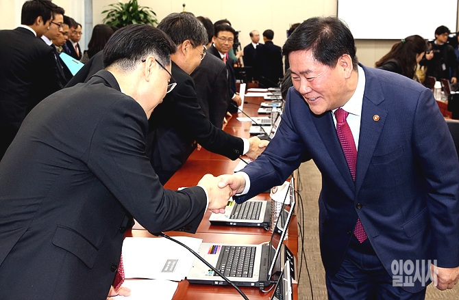 18일, 서울 여의도 국회 기획재정위원회 회의실에서 열린 전체회의 직전, 최경환 기획재정부 장관 겸 경제부총리가 의원들과 악수를 나누고 있다.