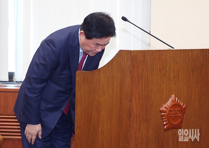 18일, 최경환 경제부총리 겸 기획재정부장관이 서울 여의도 국회에서 열린 기획재정위원회 전체회의 직전, 의원들을 향해 인사를 하고 있다.