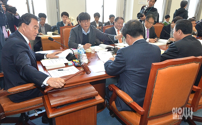 18일, 서울 여의도 국회에서 홍문표 예결위원장 주재로 예산결산특별위원회 예산안등조정소위원회 회의가 열리고 있는 가운데, 홍 위원장이 의사봉을 두드리고 있다.