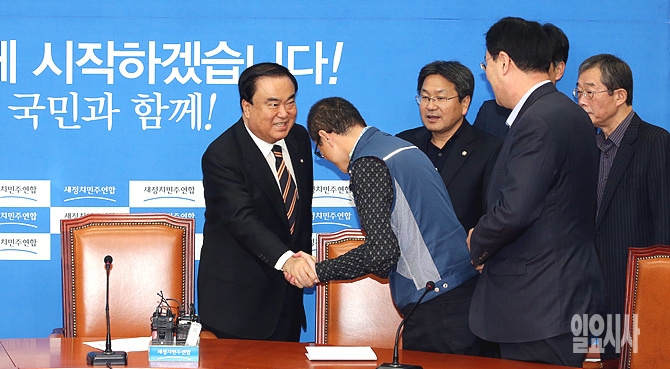 19일, 서울 여의도 국회 새정치민주연합 당 대표실에서 문희상 비대위원장(사진 가운데), 우윤근 원내대표 등 지도부가 '공적연금 강화를 위한 공동투쟁본부' 정책간담회에 참석한 이충재 전국공무원노조 위원장과 악수를 나누고 있다.
