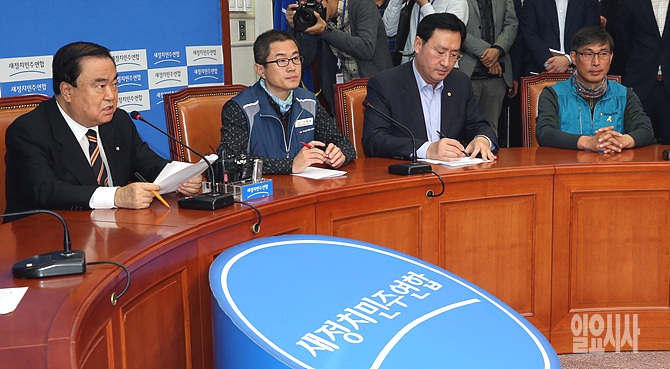 19일, 서울 여의도 국회 새정치민주연합 당 대표실에서 문희상 비대위원장, 우윤근 원내대표 등 지도부가참석한 가운데, '공적연금 강화를 위한 공동투쟁본부' 정책간담회에서 문 비대위원장이 모두발언하고 있다.